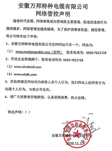 鄭重聲明:安徽萬邦特種電纜有限公司官方網站為:www_wanbangcable_com.8552110.cn,除此之外無任何子網站或合作網站,其余均為假冒偽劣。電話:0550-7621728 13485756353 地 址:安徽省天長市滁州高新技術產業開發區經四路29號